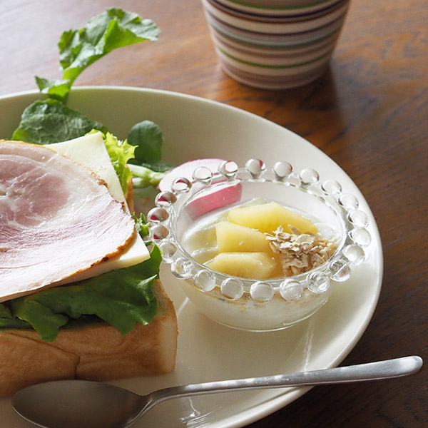 キラキラ光るガラス玉がかわいく、うっとりしてしまうポイントボウル。わたしが愛用してるφ9cmはちょっとだけ食べたいヨーグルトやドライフルーツ、またディップやソース入れにちょうどいいサイズです。お皿の上にのせられるサイズなのでワンプレートの上にのせて使うのもお気に入りです。