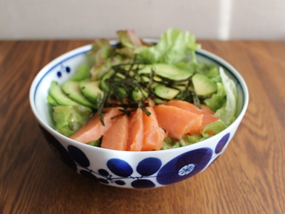 大好物のサーモンとアボカドを使ったどんぶりにしました。かなり手抜きな食事ですが、そう感じさせないのはこのボールの温かみのある花柄のおかげだと思っています。いつもは煮物などを入れるのに使っていますが、どんぶりとしても使える使用範囲のひろい器です。