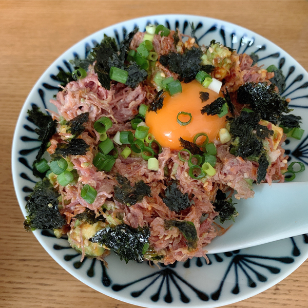 いただきものの腰塚コンビーフを贅沢につかって、アボカドとコチュジャンでユッケ風丼を作ってみました!紺色の松葉模様がコンビーフの色をおいしそうに引きたててくれています◎赤い色の食材との相性がいいので、これからの季節は赤パプリカの焼浸しや、トマトの冷たいおでんなんかを盛り付けても涼しげでいいですね~♪