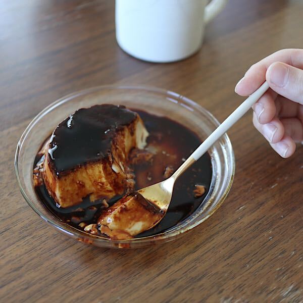 このティースプーン、先がすぼまっていて口に運んだ時にすっと口当たりがいいんです。なので、プリンやゼリーのようなつるんとしたデザートにはぴったり!!我が家ではプリン専用のスプーンになっています。