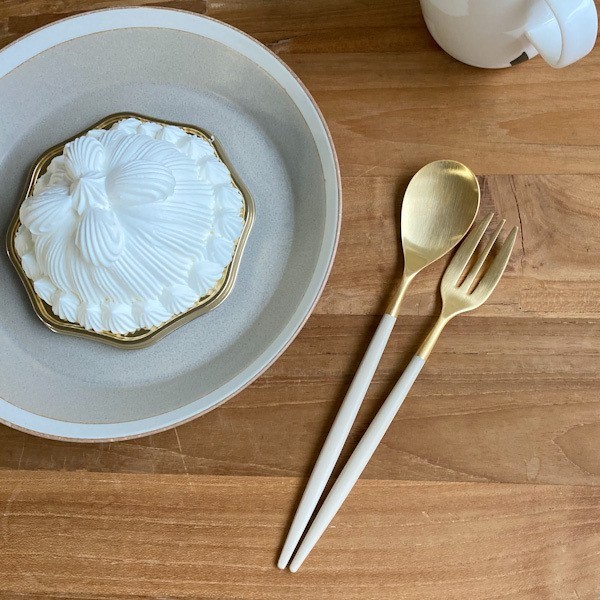 クチポールのスプーンといえば、すくう部分がまん丸いGOAのイメージが強いですが、デザートをいただく時はMIOのほうがエレガントにきまります。ゴールドxアイボリーカラーも上品で、ちょっと特別なデザートタイムにぴったり。先日、東京會舘のマロンシャンテリーを自分へのご褒美として久しぶりにいただきました。生クリームとマロンの組み合わせが超絶おいしくてうっとり。お気に入りのプレートやカトラリーがデザートタイムを優雅にしてくれます。