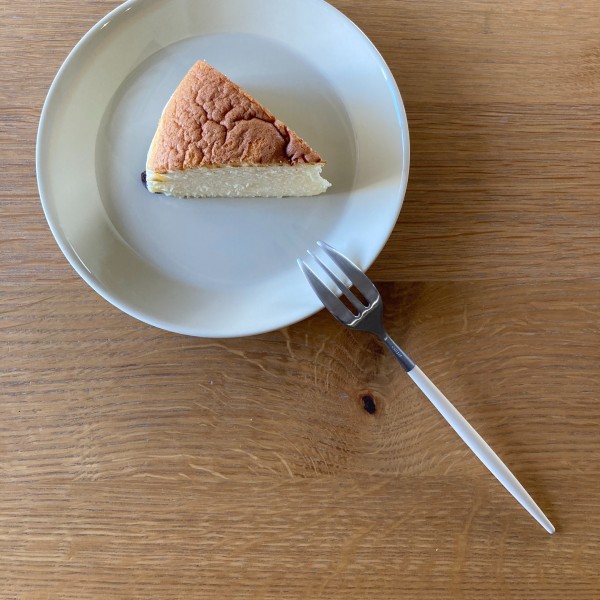 クチポールのフォークといえばGOAのシャープなイメージが強いですが、とんがり具合がちょっとこわいときも。そんなときはよりソフトでエレガントなMIOがおすすめです。中でもペストリーフォークは丸っこいかたちで子どもも安心して使えます。おやつはおみやげでいただいた、りくろーおじさんのチーズケーキ。ふわふわやわらかなスフレタイプのケーキにMIOのしずく型ベースのフォークがぴったりでした。懐かしい味でほっこりとおいしかったです。