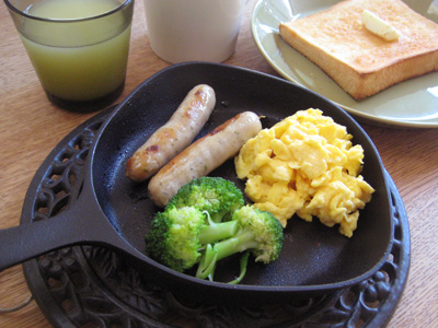 鉄のフライパンで焼くことで、より一層美味しくなる食材があります。そんな時は表面加工派の私もリバーライトのフライパンを出します。中でも20cmは気軽に出せて、ソーセージやベーコン、野菜などを焼いて「そのままテーブルへ」が出来るサイズ感。この日はグルグルと渦巻きになっているソーセージを丸ごと焼きました。熱々のまま食卓へ!家族も盛り上がっています。鉄なら直接フォークとナイフで切り分けてもへっちゃら。うーん、パリッとジューシー!