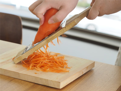お弁当の彩り要員として、常備しているキャロットラペ。以前は包丁でせん切り派でしたがスタッフのみんながスライサーを使ってるという情報を耳にしてわたしもついにデビューしました。使ってみるともう元には戻れない便利さ。包丁でせん切りすると具材を揃えたりするのに思わぬ時間がかかったりしますが、このスライサーを使えば人参1本スライスするのに3分ほど。今度は作りたいと思っていながら道具がなくて作れていなかったじゃがいものガレッド作りに挑戦したいと思ってます。