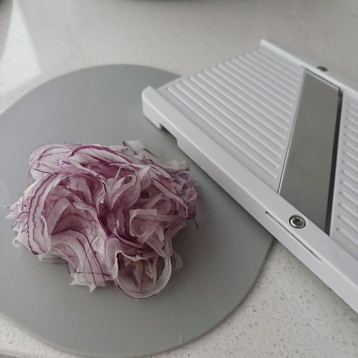 とんかつ屋さんで出てくるふわふわの千切りキャベツ体験をしてから即購入したサンクラフトのキャベツスライサー。今日はサラダに使うレッドオニオンをスライスしてみました。見てくださいこのふわふわの美しく繊細なスライス。水にさらして食べると、絶妙な薄さのおかげなのか辛味もあまり感じず美味しく頂くことができました。包丁で切るよりも見た目が美しく、料理の腕前が上がっちゃったかな?と錯覚を起こすレベルです。これから大好きな新玉ねぎの季節なので、相棒のスライサーでどんどんスライスしていこうと思います!