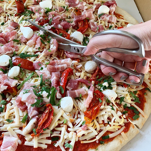 私は今、コストコで買ってきた大きなピザを冷凍保存するためにカットしています。そんな時に活躍するのが「鍛造オールステンレスカーブキッチン鋏」。長く、そしてカーブした刃は食材をお皿などに置いたままでも切ることを可能にします!ピザもザクザクカット。もちろん焼きたてのピザもカットできますよ。普通のハサミの形状だとなかなかこういう使い方が難しいのです。分解してスッキリ洗えるので、チーズやトマトソースまみれになっても大丈夫!