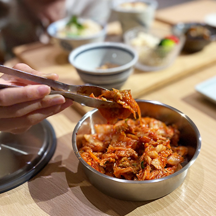 納豆は夜に食べたほうが健康にも美容にも良いと聞いてから、夕飯に納豆を食べるようになりました。私はシンプルにネギ派ですが、娘はキムチを入れるのが大好き。そんなわが家のキムチ保存に欠かせないのが、家事問屋の丸型保存容器。サイズは一番小さい「40」を使っていますが、市販のキムチパック1つ分がちょうどよく収まります。ステンレス製なので色移りせず、酸にも強くて清潔に保てるのがとても安心。パッキンを付ければニオイ漏れも気にならず、完全密閉ではないが故にフタもとても開けやすいんですよ。