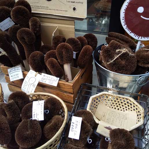 東京築地のつきじ常陸屋の店舗ではいろんな形のたわしが並んでいます。その中から厳選した5種類をプロキッチンではご紹介していますが、なかでも私の定番は「棒付束子 大」です。棕櫚のたわしに木製の棒がついているので、熱いフライパンを洗ったりグラスを洗ったり、棒がついているからこその使い道がありとても便利です。棕櫚の繊維は柔らかいので道具や食器を傷つけにくく、湯呑みの茶しぶ等はきれいに取り除けるというスグレモノです。使ったあとはたわしをよく振って水気を切り、風通しの良いところに掛けてください。