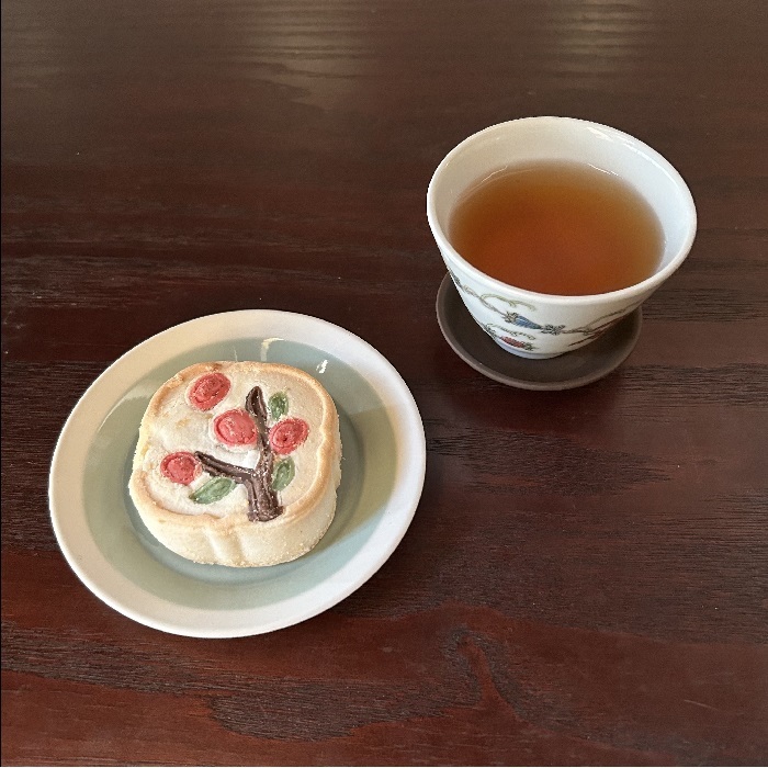 イイホシさんのピスタチオのプレートは、やさしい色合いと程よいサイズ感が魅力の一枚。お土産でいただいた、かわいい梅の模様のお菓子をのせると、器のやわらかなグリーンが絵柄を引き立ててくれました。取り皿としてはもちろん、小さなおやつや果物にも使いやすく、出番の多いサイズです。主張しすぎない色味は、器や料理を選ばず自然になじみ、日々の食卓でいつもの器とも合わせやすいプレートです。