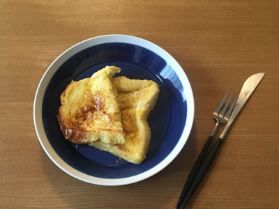イイホシユミコさんの器dishesシリーズはマットなカラーとつやありカラーがあるのですが、暑い夏におすすめなのがつやありのインクブルー。深い青色が夏の夜の色を思い出させます。朝から暑い季節、このお皿で気持ちだけでもひんやり。今日の朝食はフレンチトーストに。