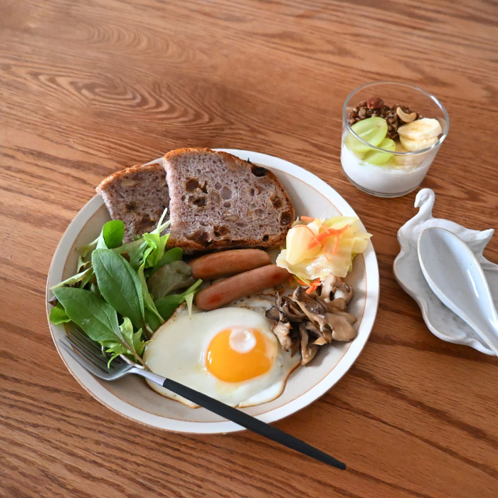 20cmプレートには朝食の目玉焼きやベーコンのソテーを盛り付けたり、夕食にはお刺身などの和食を盛り付けても。余白も画になる器ですので、焼き菓子やケーキを盛り付けても見栄えよくまとまります。料理を包み込むように広がるたっぷりとしたリムが付いているため、汁気のある料理を安心して盛り付けることができます。
