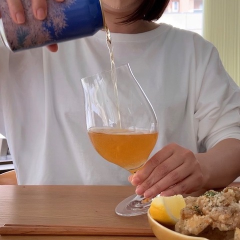私のお気に入りグラスの一つがこれ。ワイングラスのようにボトムが膨らんでいて、飲み口が薄く少し反った形なのでダイレクトにビールを感じることができます。私の場合このグラスに注ぐ時は最初、グラスに沿って静かに注ぎ、途中からビールを高い位置から泡を細かく立てるように注いでいます。こうするとビール自体の苦みもしっかり感じながらクリーミーな泡も楽しめます。私はグラスを2脚冷やしておいて、1本目が終わったら冷えてるもう1脚に2本目を。1人でも2脚持ち結構いいですよ。
