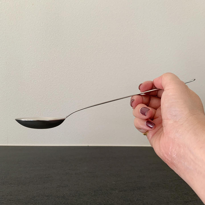何を隠そう、このやくさじ。一本で計る、混ぜる、すくうなど何役もこなす頼もしさ。大さじ15mlと小さじ5mlの2種類があり、どちらもハンドルが長く、スプーン部分を浅めに仕上げています。そのため、半球型の計量スプーンと比較すると味噌や粉物の計量をした際にスプーンに残りにくく、汚れを落としやすいのがポイント。浅めにしてもスプーンとハンドルの角度を調整することで、水平を保ちながら正確な計量ができます。