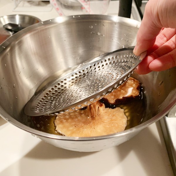 今までさんざん試行錯誤してきた干ししいたけの戻し方問題。水面にラップを密着させてみたり、空き瓶に水と干ししいたけをいれてみたりしてきましたが、ついにこの問題を解決するアイテムに出会いました。コンテのまかないボウル180に1サイズ小さいまかない平ザル130を落とし蓋として使えば、パンチ穴から上部に水を逃がしつつ、程よい重さで浮き上がってくる干ししいたけを押さえられるので、しいたけの全身が水に浸かるのです。これで途中、ひっくり返すけど軽い部分が浮いちゃってイライラすることも無く、硬い部分が残っちゃうという悲しい出来事はなくなりプチストレスから解放されました!