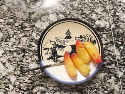 しんしんと降り続ける雪を見上げるムーミンの愛らしい表情がとても癒される絵柄のプレート。愛用しているムーミンマグと同じ絵柄であることに気付き、最近はこのセットでのおやつが定番となりました。15.5cmと大きさも手ごろでちょうど良く、何よりムーミンの表情に日々癒されています。
