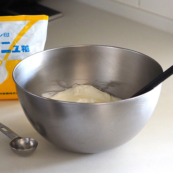 一人暮らしの時から愛用している柳宗理のボウルとザル。この23cmボウルはほかのサイズと形が違っていて、傾斜が少しきつめになっています。この形状は生クリームをホイップする時に中身を飛び散りにくくするため、とどこかで読んでなるほど~と感心したことを覚えています。実際使っていてもこの角度が泡立て器にもフィットするし、電動泡立て器を使っても飛び散りが最小限に抑えられます。もちろん生クリームだけでなくケーキの生地にも!