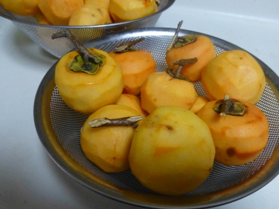 干し柿用にたくさんの渋柿をもらいました。1人でむくと大変ですが、おしゃべりしながら2人で皮をむくと意外にはかどります。むいた柿は柳宗理のパンチングストレーナーに。 しっかり安定しているので、たくさん柿をのせても安心です。お天気があまり良くなかったので、翌日までパンチングストレーナーで保存。美味しい干し柿になりますように!