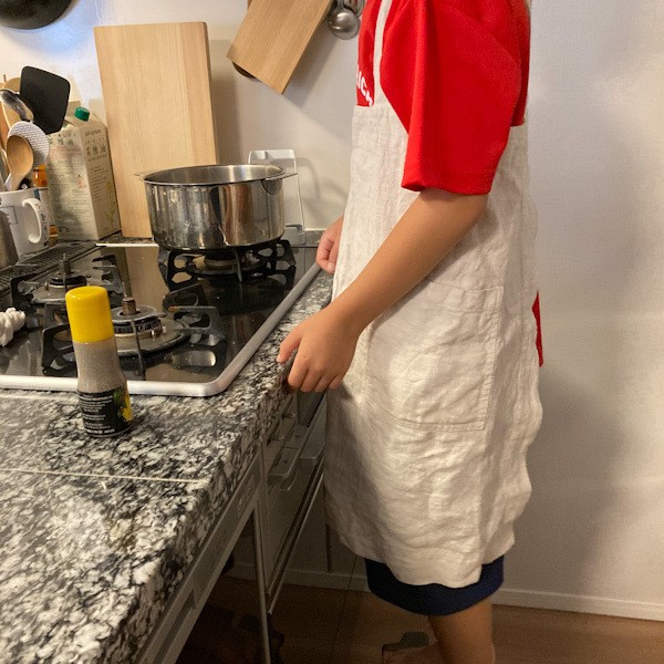 我が家の日曜朝食の定番はホットケーキです。メインで作るのはこどもたち。粉まみれになってしまうのでエプロンの着用は必須です。リネンテイルズのキッズエプロンはひもで結ぶタイプではなくかぶるだけなので蝶結びができない子でも簡単で、締め付け感がありません。保育園の頃は肩ひものところで折って縫って使っていましたが、今120cmくらいで縫い目をほどいて着たらちょうどいいサイズ感です。丈夫で乾きが早く、長い間大活躍してくれるのでなかなかのコストパフォーマンスなんじゃないかと思ってます。プレゼントにもおすすめ。