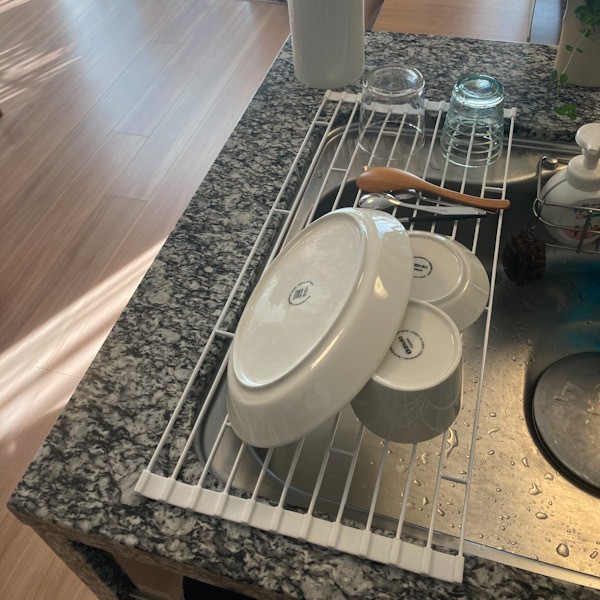 基本的に食器洗いは夫か食洗機頼みの私。いつも夕食後の後片付けのときに食洗機にかけるのですが、洗剤までセットしてスイッチを入れ忘れるという痛恨のミスをし、朝あわててスイッチを押すことが時々あります…。そんな時、朝食で使って洗った食器を置く場所がないのでこのラックが登場。使っていないときはくるくる巻いてキッチンの引き出しの段差みたいなところに収納できるので、食洗機メインの我が家にはピッタリです。今の状況ではなかなか機会がないですが、祖父母と一緒に食事をするときなど、食洗機に収まりきらないくらいの食器を使うときにも活躍します。