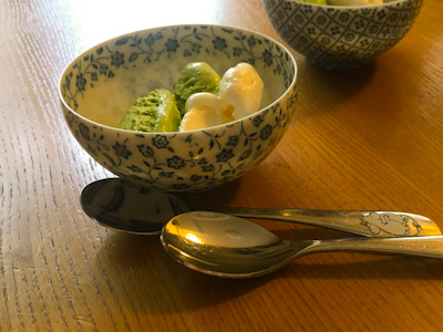 丸直製陶所の陶碗は冷茶だけでなくひんやりデザートにもぴったりです。とっても薄くて軽いのですが高温で焼き上げている磁器なので見た目より強度があり、ガラスのコップと同じような扱いで大丈夫なのも嬉しいです。