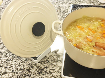我が家ではごはんをルクルーゼで炊いています。すごくおいしく炊けるのですが、いつも鍋ふたのやり場に困ってました。ふたをとって置いておいて、またふたしようとするときに必ず「アチチ…」。でもこのお玉&鍋ふたスタンドがやってきてからはそんなプチストレスがなくなりました。お玉だけでなく菜箸もおけるのでお鍋の季節にも大活躍です。