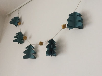 ハロウィンも終わって街はクリスマスな雰囲気になってきました。まだクリスマスツリーがないので、まずはガーランドで冬じたく。華やかなゴールドもいいかなと思いましたが、シックな印象のグリーンで。こども達がみつけて「わー!ツリーだー!」とはしゃいでおりました。