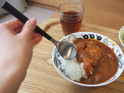 オールステンレスのカトラリーに比べてずっしりと重く、持った時「おっ」と思いますがこれが逆に安定感があるんです。デザートスプーンという名前ですが、カレーやスープを食べるときにちょうどいい。黒柄がブラパラによくあいます。丸みがあって温かみがあり和食器との相性もいいカトラリーです。