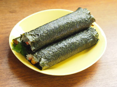 BLOOMリースのプレートは瑠璃色のお花模様が器を取り巻いていて品があります。ちょっとしたものもおいしそうに、素敵に見えます。このSサイズは取り皿にちょうどいいサイズ。今日はキンパをのせてみましたが、ショートケーキなんかのせてもいいな~♪