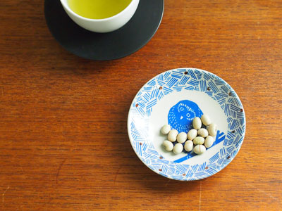 kata kataの食器は味わい深い藍色とかわいらしい図案でほっこりします。このふくろうも首を傾げている様子がかわいい♪ふくろうは猛禽類なので炒り豆は食べないと思うのですが、この小皿は節分であまった炒り豆をポリポリ食べるのにちょうどいい大きさでした。醤油皿やごはんのおともをのせるのにもいいですね。